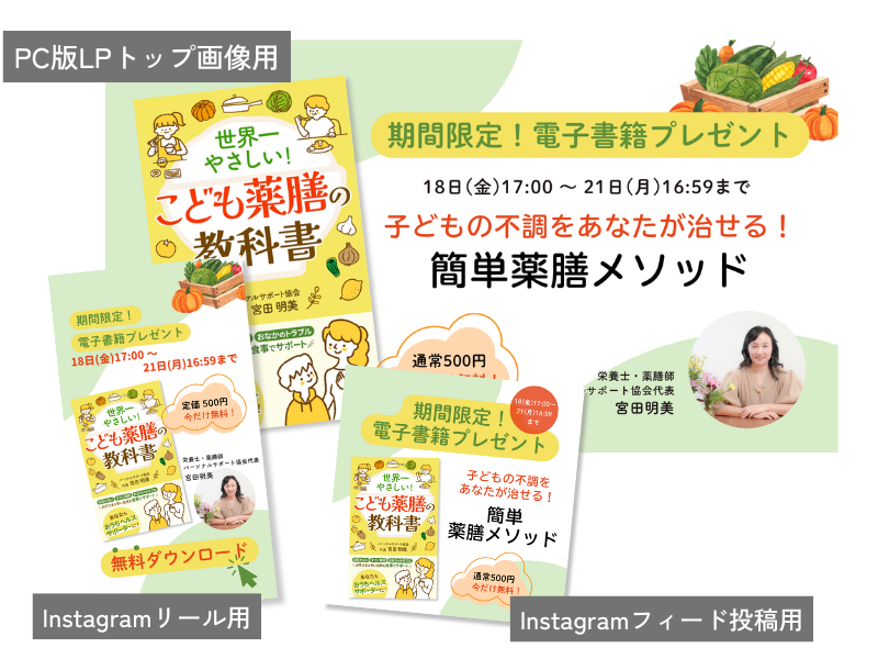 パーソナルサポート協会 宮田明美様Canvaの編集可能なデータで広告用・LP用とサイズ違いで作成してもらったので、キャンペーンで強調したい言葉や日付変更ができて便利です。SNS発信に迷ったら、とりあえずこのデータを活用しています。