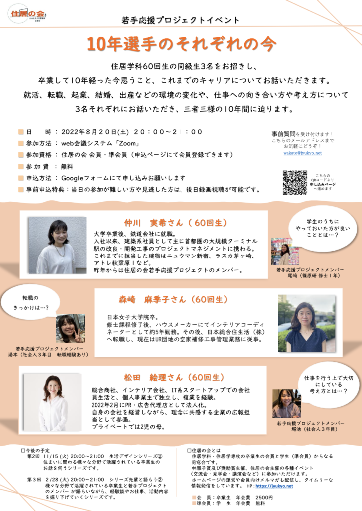 代表の松田絵理の母校である、日本女子大学 家政学部 住居学科の同窓会「住居の会」様が活動する、若手応援プロジェクト「10年選手のそれぞれの今」。