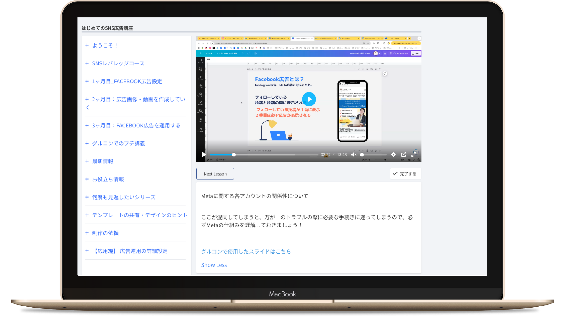 カリキュラムの進めるスピードは各自にお任せしています。早々に1ヶ月目から広告を運用したいという方も、もちろん大歓迎です!運用経験のある方は、複数の目的別の広告について詳しくグルコンでお伝えしていきますので、広告の使い分けをしていきましょう。